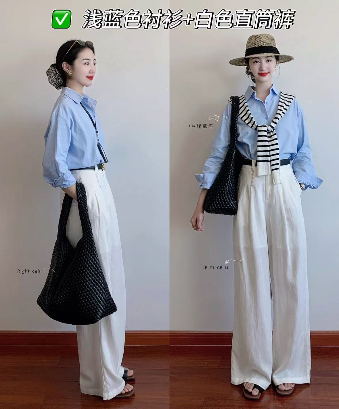 蓝白配是春天的经典组合,暴露又显年青。前锋博主这套浅蓝衬衫+白直筒裤的穿搭,中枢是暴露从简+细节加分: