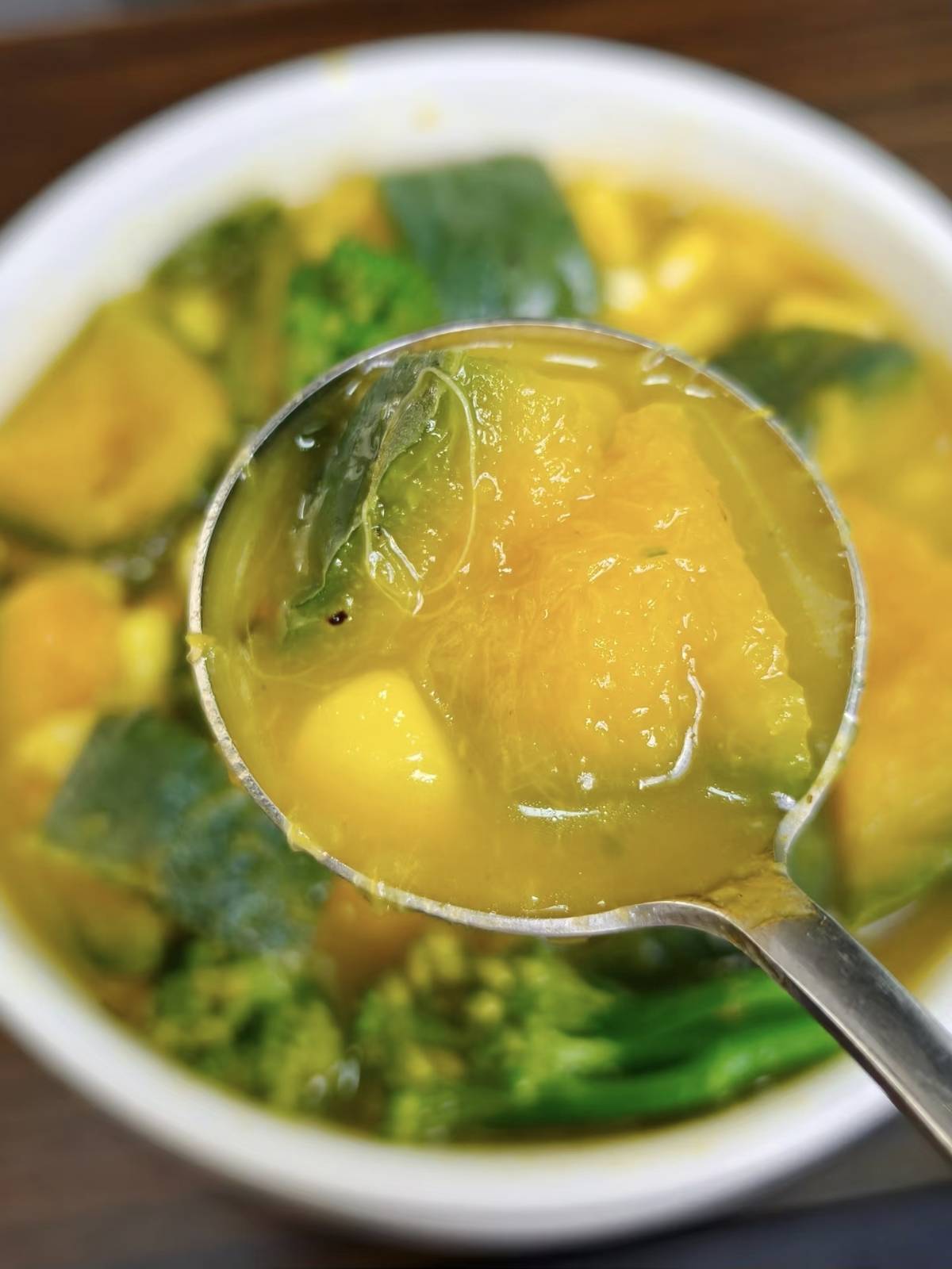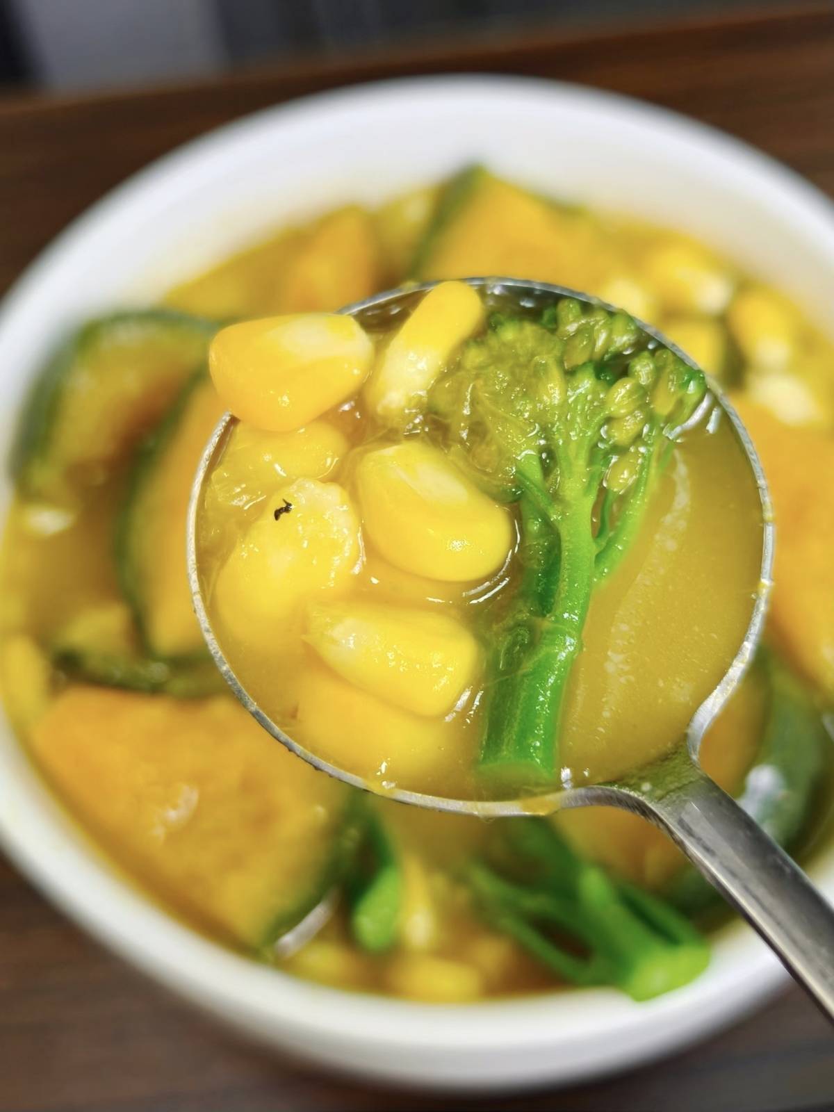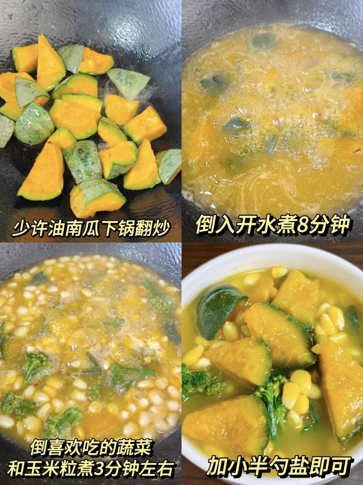 3. 用勺子将部分南瓜和玉米压碎,让汤更浓稠,心爱甜味可加一丝冰糖,煮2分钟即可出锅。