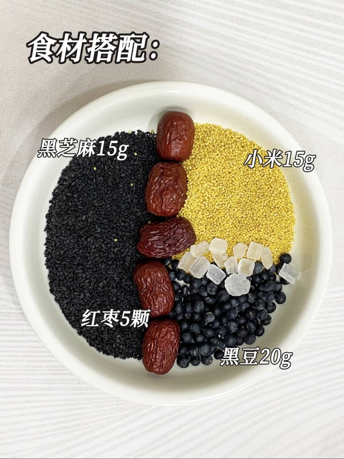 1. 准备小米30克、黑芝麻15克、黄豆20克,黄豆提前泡发更好打;
