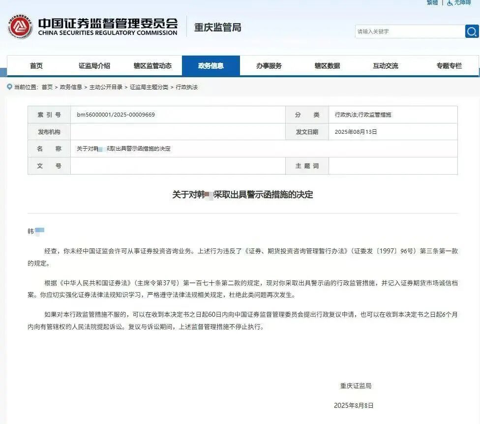 现在,该责任室已被重庆阛阓监督搞定局列入“谋略十分名录”。重庆证监局也认定韩某确乎存在违警推选股票的行径,况且对她出具了警示函。